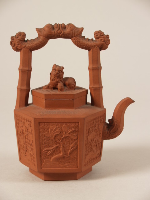 | Nederlands | Theepot, zeshoekig, met staand handvat en op het deksel een leeuw, de zijkanten hebben een decor van bloemranken |