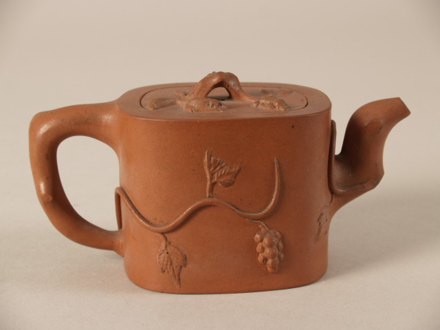 Theepot met onderdelen in de vorm van knoestige takken en met decor van druivenranken (Q24340)