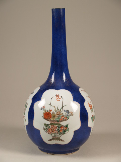 Flesvaas met decor van cartouches waarin symbolen op een powderblue ondergrond, famille verte (Q24346)