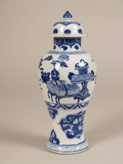 Versiering in kobaltblauw. Op de voetring en op de schouder onder de rand elk een lei-wên-band. Op het midden van de wand een band met om en om staande en hangende driehoeken, elk met een halve rozet. Onder deze band 2 hele en 4 halve ruyi-kopsgewijs afgesloten medaillons met op blauw uitgespaard witte bloemetjes en bladrankjes. Boven de band de symbolen van de geleerde. Op de rand een krans van hangende ruyi-koppen met daaronder kleine bloemen; deze combinatie herhaalt zich op het gewelf van de deksel, waarvan de knop blauw gekleurd is. (Nederlands)