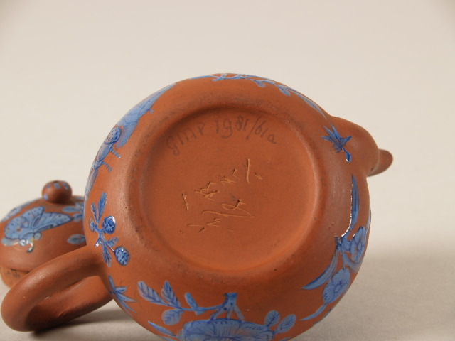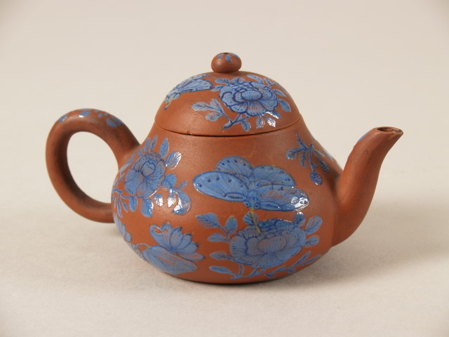 Theepotje met decor van vlinders en bloeiende ranken in blauw email (Q24361)