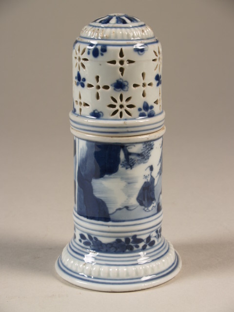 | Nederlands | Strooier met decor van rivierlandschap met figuur, chine de commande |