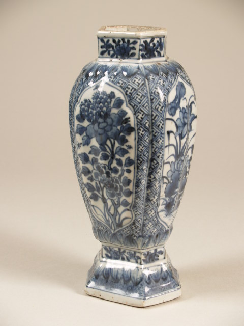 Pot met vierkante buik, zeshoekige mond en voet, en decor van panelen waarin bloeiende planten (Nederlands)