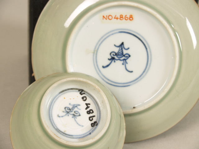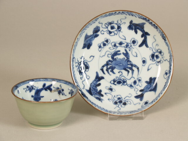 Kop en schotel met decor van zeedieren, celadon en onderglazuur blauw (Nederlands)