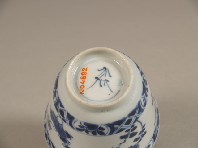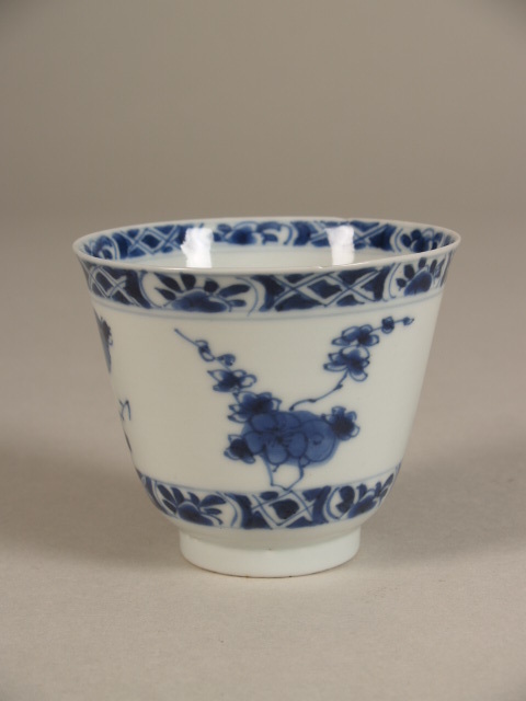 Konvekse bodem, afgerond v-vormige voetring, s-vormig spreidende wand. Materiaal - zeer licht geel brandend porselein met groen getint glazuur. Onderkant voetring ongeglazuurd. Versiering - in kobaltblauw. Plat: een wolkkompleksje. Boven en onder langs de wand elk een dubbele bies. Wand ext.: drie medaillonvormige rankkompleksen, afgewisseld door telkens twee wolkjes. (Nederlands)