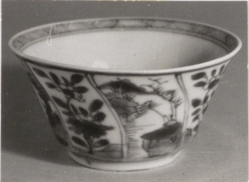 4 kopjes zonder schotels met decor van vakken waarin landschapjes of bloemranken (Nederlands)