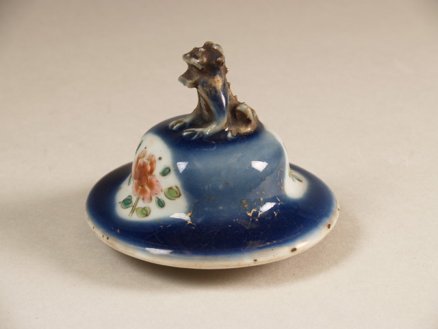 | Nederlands | Deksel, rond, donkerblauw met uitgespaard decor van bloemen, beeld als knop, famille rose |