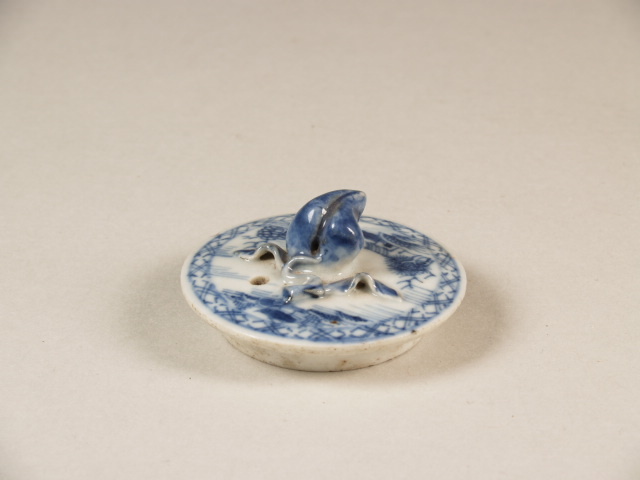 Deksel van theepot met knop in de vorm van een perzik en decor van meerlandschap (Nederlands)