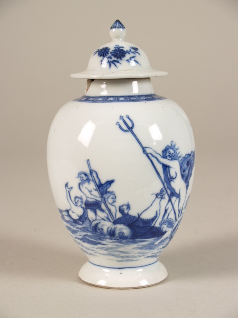 Vaas met halfbol gewelf, versierd in onderglazuur blauw. Op de wand is een scène te zien van een blote man met een drietand in zijn linkerhand. Hij wordt vergezeld door eveneens blote mannelijke en vrouwelijke figuren. Ze worden als het ware ondersteund door een aantal zeebeesten. De randen meestal versierd met een honingraatpatroon en boeketten pioenrozen en chrysanten.De man die de hoofdfiguur op de afbeelding is, is Neptunus. Hij wordt omringd door Tritons en Nereïden. Neptunus is de god van de zee in de klassieke mythologie en komt in vele vormen voor op chine de commande vanaf 1740. De originele bron die ten grondslag lag aan deze voorstelling is een prent van de hand van Frederick Bloemaert (1610-1669). Alleen versies in onderglazuur blauw zijn bekend, wat nogal verrassend is aangezien deze objecten speciaal in Jingdezehen gemaakt moesten worden en daarom kostbaar waren. (Nederlands)
