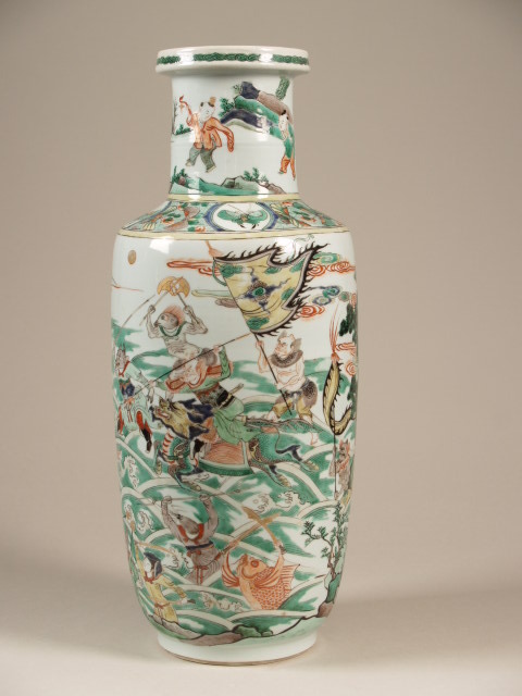 Rolwagen met op de wand een voorstelling van een landschap met een klein paviljoen waar twee mensen vluchten voor een halfnaakt boeddhistisch jongetje met vlammende wielen, dat een aantal zwaar gewapende demonen over zee aanvoert. Op de schouder vier medaillons met elk een vlinder op een groene ondergrond. Tussen de medaillons steeds twee vlinders. Op de hals een landschap met drie jongens. Op het staande deel van de rand een spiralenrandje. De decoratie is uitgevoerd in famille verte emailkleuren. De scene komt uit het verhaal 'Ne Zha Disturbing the East Sea' dat onderdeel is van de verhalenreeks 'Fengshen Yanyi'. Te zien is Ne Zha op zijn vlammende wielen in gevecht met het drakenleger en met zijn attributen (cosmische ring en bovennatuurlijke zijden sjerp) in de hand. (Nederlands)
