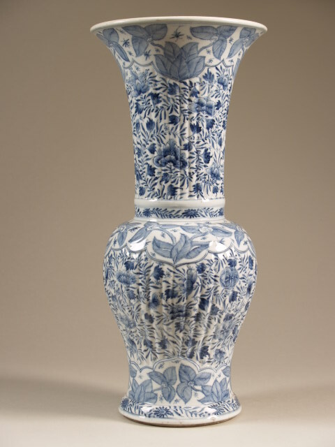 Vaas, verticaal geribbeld langs hals en buik, met decor van bloemen (Nederlands)