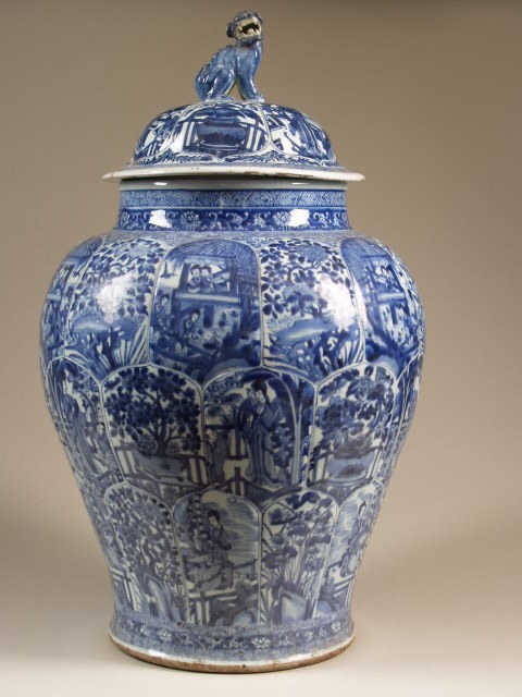 | Nederlands | Pot met deksel met 3 rijen panelen in reliëf met decor van figuren in landschap of interieur, afgewisseld door panelen met bloeiende planten |