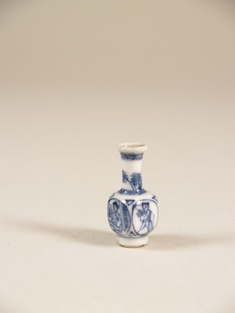 Miniatuurfles met vierkante buik en decor van mensfiguurtjes in onderglazuur blauw (Nederlands)