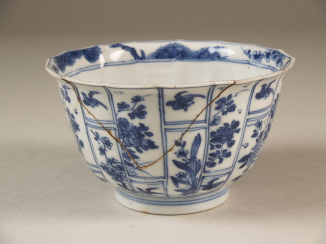 Kop, veelhoekig, met vakken waarin een bloemrank of vogel