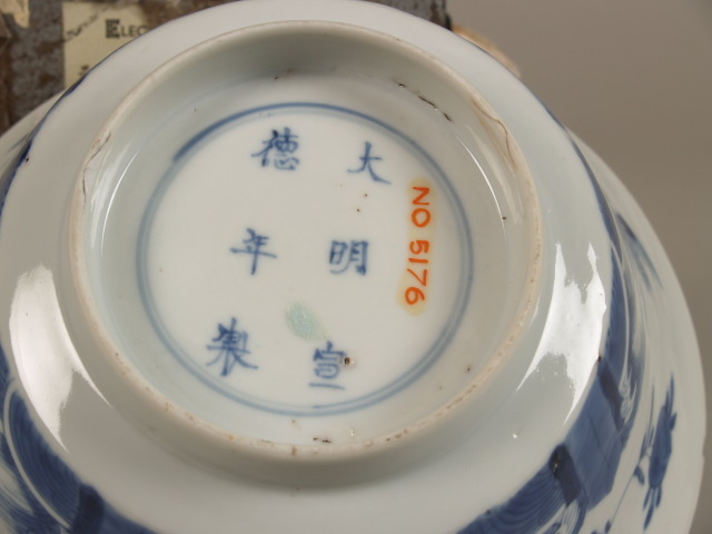 in kobaltblauw op de bodem vertikaal zesmerk Xuande in dubbele ring (Nederlands)