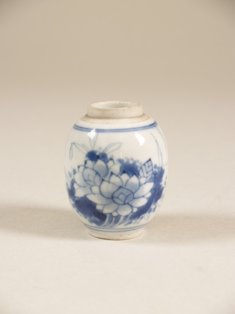 Miniatuurpot zonder deksel met decor van lotus in onderglazuur blauw