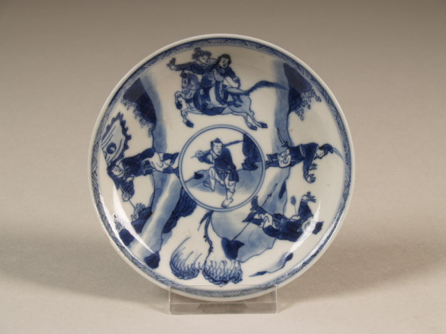 Schoteltje met decor van 2 figuren op een paard en 3 te voet, 1 van 2 (Nederlands)