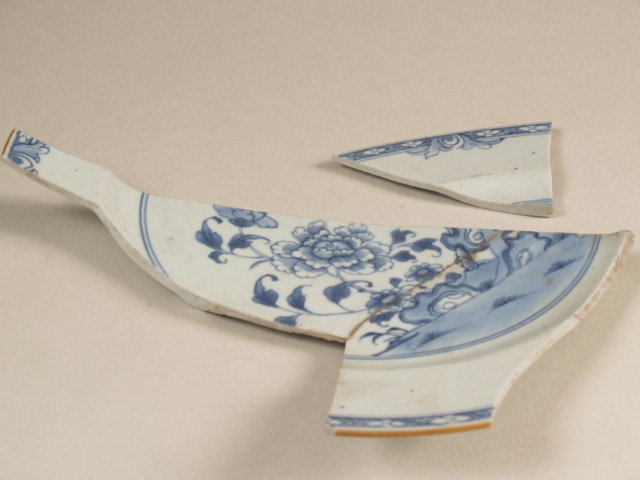 Scherf van bord met decor in onderglazuurblauw van bloemen (Nederlands)