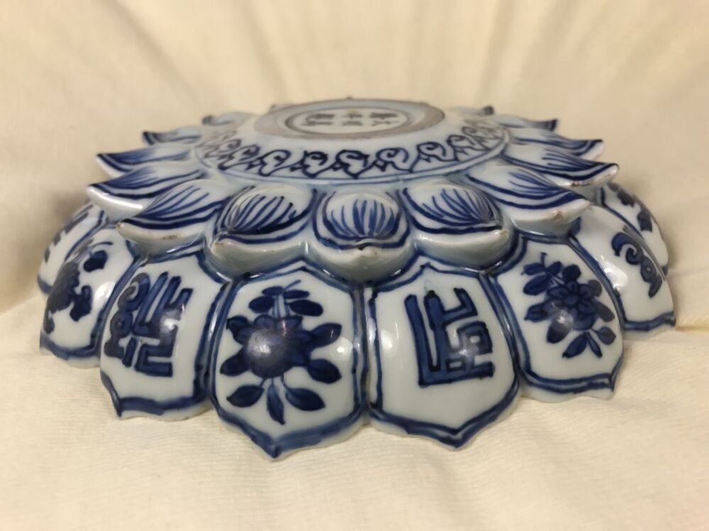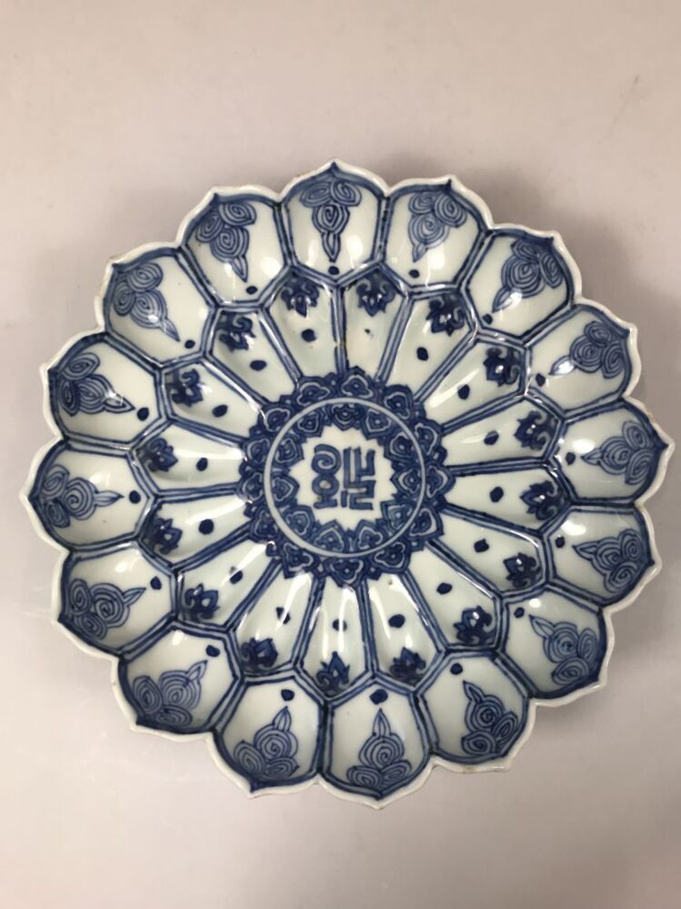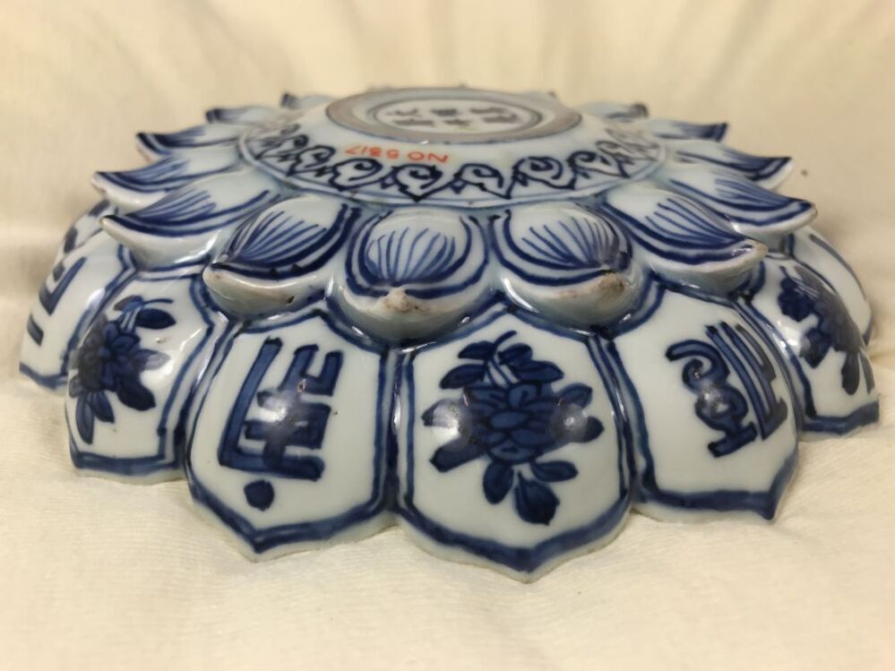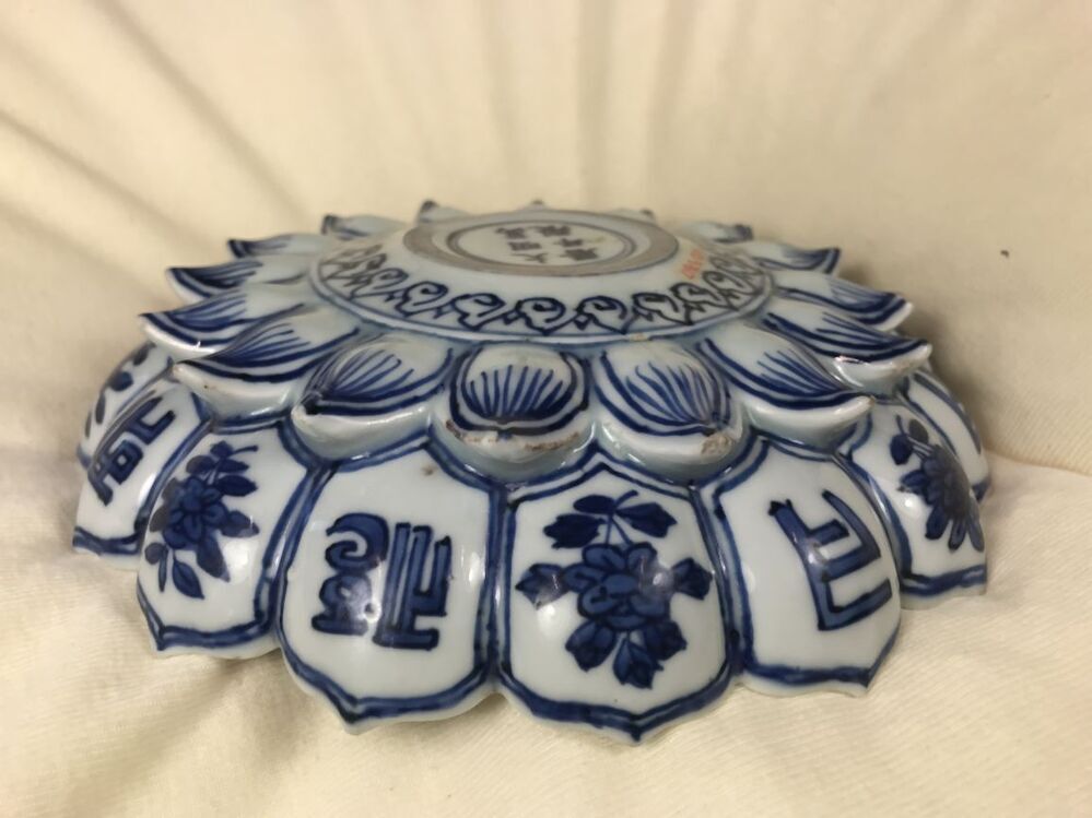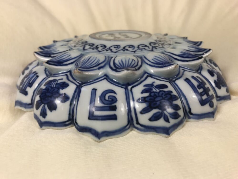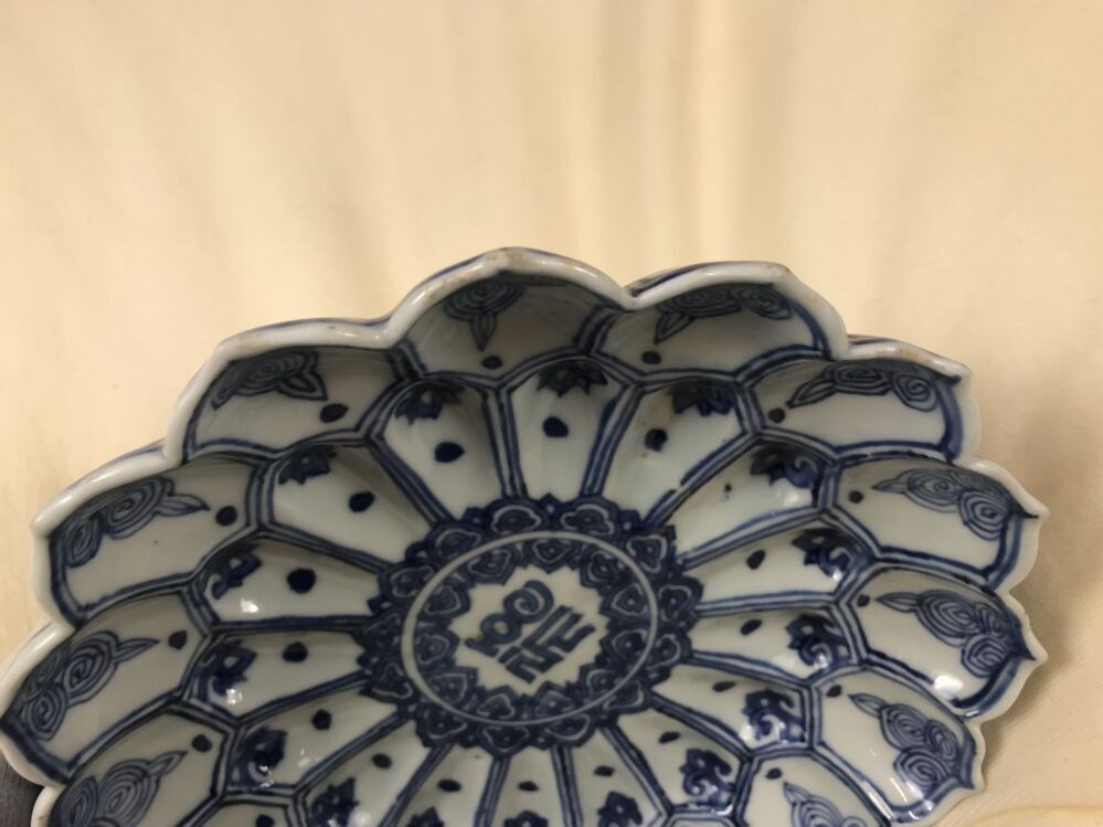 Uitgevoerd in de vorm van een lotusbloem. Schaal met op de bovenzijde een centrale voorstelling van een sanskrit-teken in een dubbelen ring die van binnen en buiten omgeven is met Ruyi ornamenten. In de binnenste rand van lotusbladvormige delen telkens een stip en een hangend rankstukje. In de buitenste rand telkens een stip en een hangend element dat uit spiralen is opgebouwd. Op de onderzijde zijn de binnenste delen ingetekend en in de buitenste om en om een bloemtakje en een sankrit-teken. De decoratie is uitgevoerd in onderglazuur blauw. De karakters zijn waarschijnlijk geschreven in het Saddham of Lantsa schrift, dit is een vorm van Sanskrit. De schaal is mogelijk een gift geweest aan een boeddhistische tempel. Er bestaan meerdere van dit soort schalen bekend, o.a. V&A. (Nederlands)
