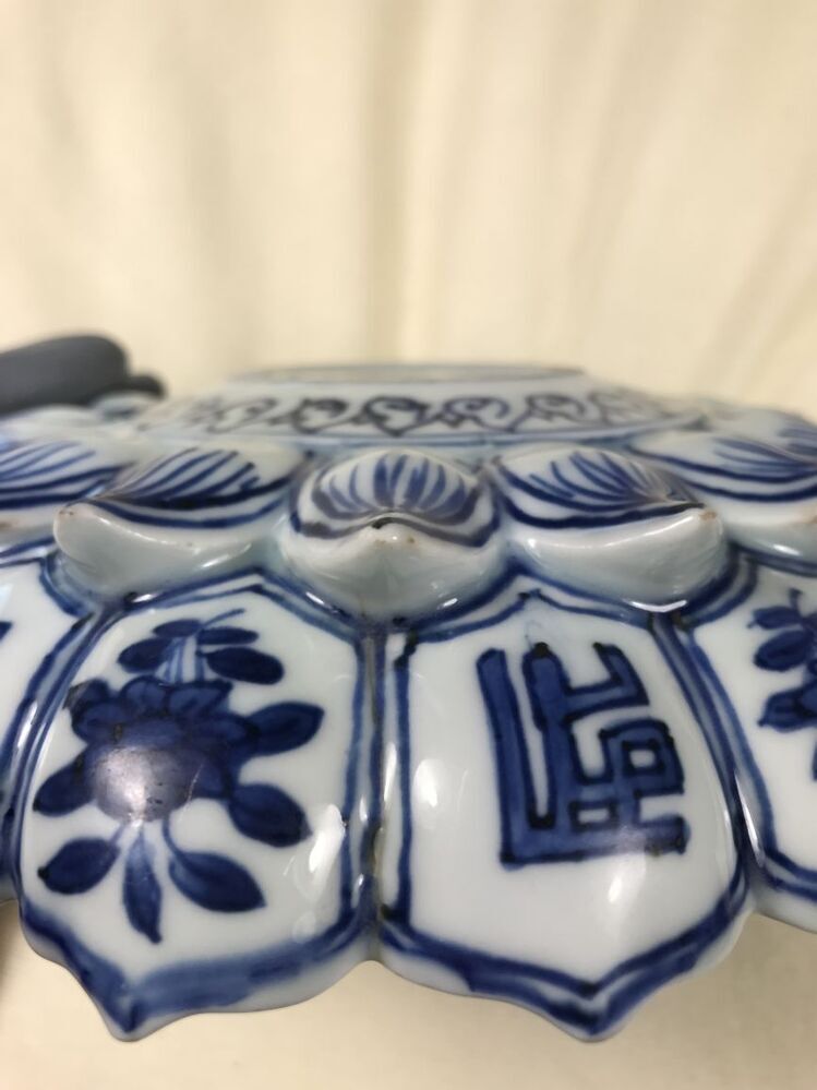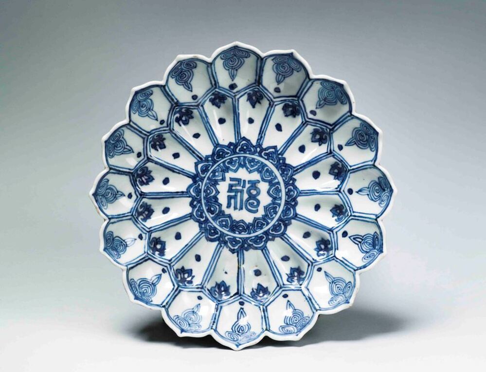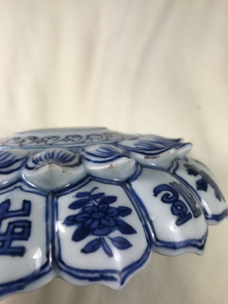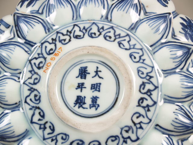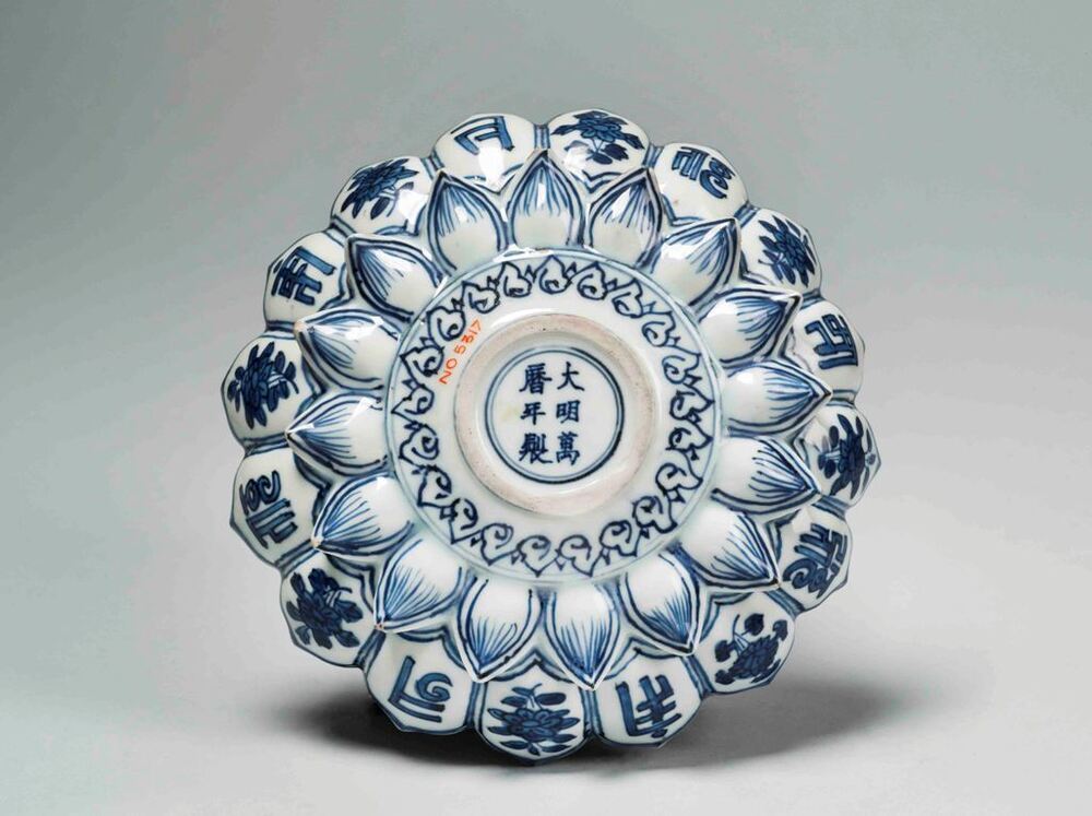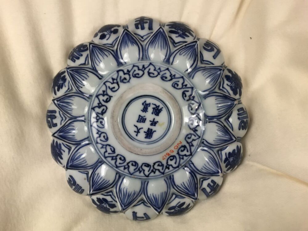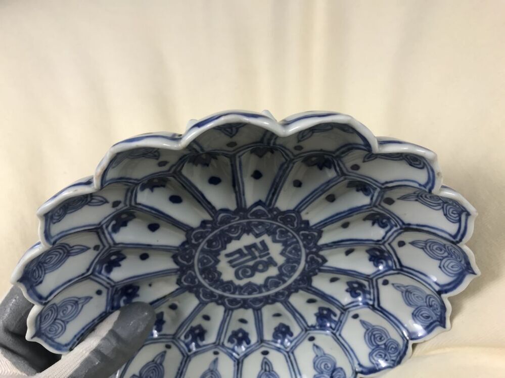 Uitgevoerd in de vorm van een lotusbloem. Schaal met op de bovenzijde een centrale voorstelling van een sanskrit-teken in een dubbelen ring die van binnen en buiten omgeven is met Ruyi ornamenten. In de binnenste rand van lotusbladvormige delen telkens een stip en een hangend rankstukje. In de buitenste rand telkens een stip en een hangend element dat uit spiralen is opgebouwd. Op de onderzijde zijn de binnenste delen ingetekend en in de buitenste om en om een bloemtakje en een sankrit-teken. De decoratie is uitgevoerd in onderglazuur blauw. De karakters zijn waarschijnlijk geschreven in het Saddham of Lantsa schrift, dit is een vorm van Sanskrit. De schaal is mogelijk een gift geweest aan een boeddhistische tempel. Er bestaan meerdere van dit soort schalen bekend, o.a. V&A. (Nederlands)
