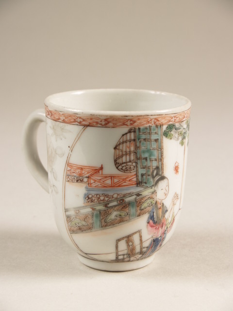 Kop met oor en decor van interieur met vrouwenfiguur en kind, famille rose (Nederlands)