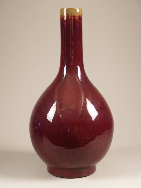 Vaas met hoge hals en koperrood glazuur met flambé langs de rand (Q24613)