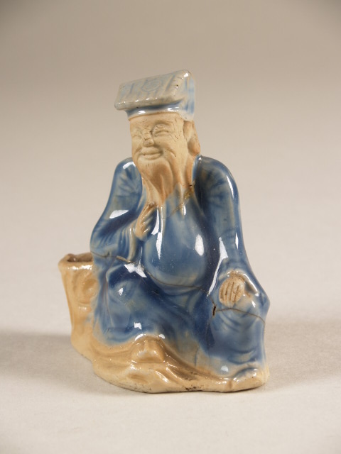 Waterdruppelaar in de vorm van een zittende man met blauwe mantel (Nederlands)