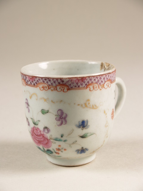 Kop met oor en decor van bloemen in emails famille rose op een grijs-wit fond