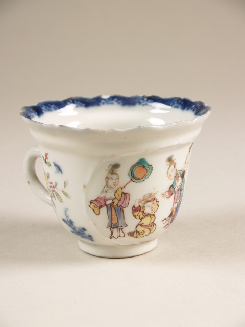 | Nederlands | Kop met oor, geschulpte liprand en decor van bloemen en figuren, famille rose |