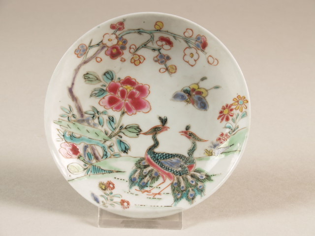 Schoteltje met decor van 2 pauwen tussen bloemen in een landschap, famille rose (Nederlands)