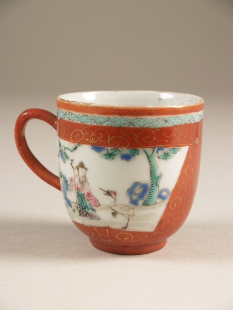 Kop met oor met polychroom decor van landschapjes op ijzerrood fond met verguldsel (Nederlands)