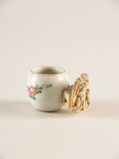 Kuikendrinkbak dan wel vogeldrinkbakje met ivoren klem en polychroom floraal decor (Q24686)