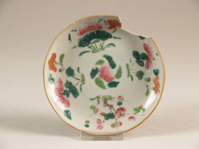 Schoteltje met polychroom decor van bloemen en perzik (Nederlands)