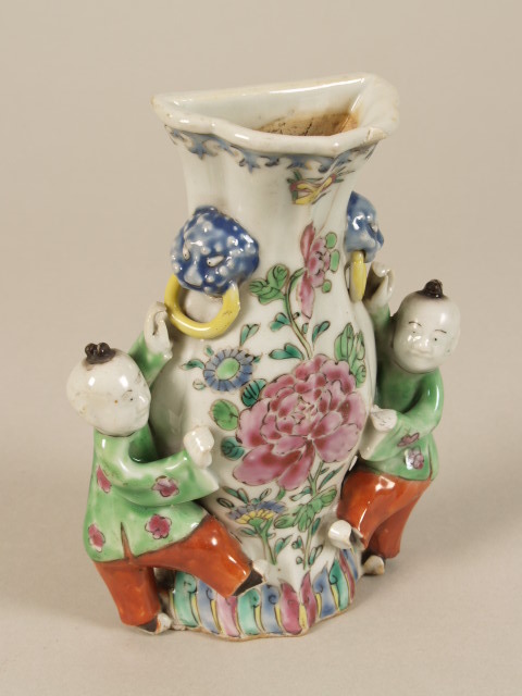 Wandvaas in de corm van afgeplatte vaas die wordt gedragen door 2 zotjes, famille rose (Nederlands)