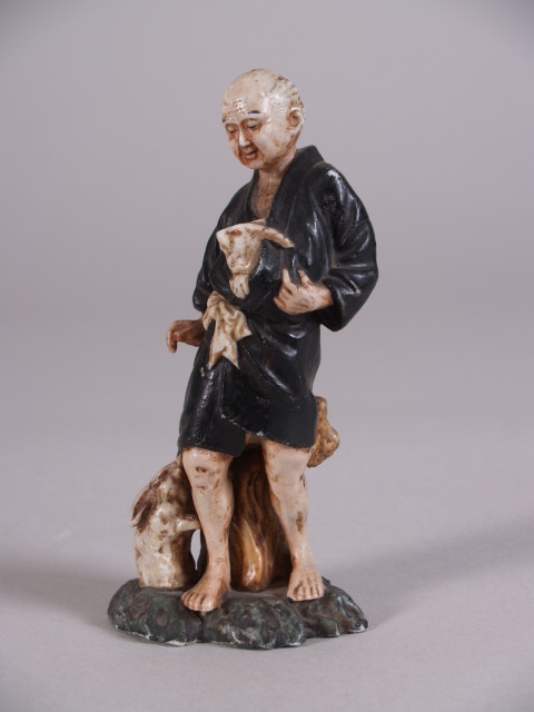 Beeld in de vorm een man in traditionele kleding met 2 hazen (Nederlands)