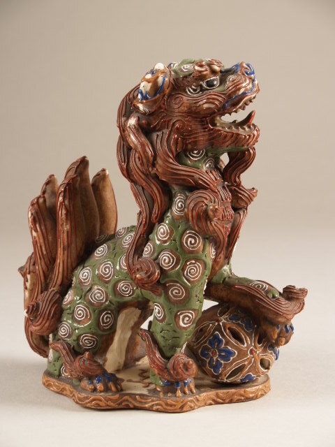 Beeld van polychrome boeddhistisch leeuw met bal (Nederlands)