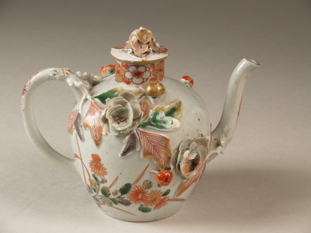 Theepot met floraal decor, deels in hoog reliëf (Nederlands)