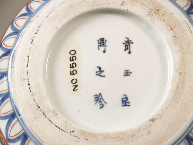 op de bodem in kobaltblauw vertikaal zesmerk ch'i yü t'ang (?) ting chih chên, een verbastering van Ch'i shih yü ting chih chên, "een sieraad temidden van kostbaar vaatwerk van een zeldzame jade", een Chinees aanbevelingsmerk. (Nederlands)