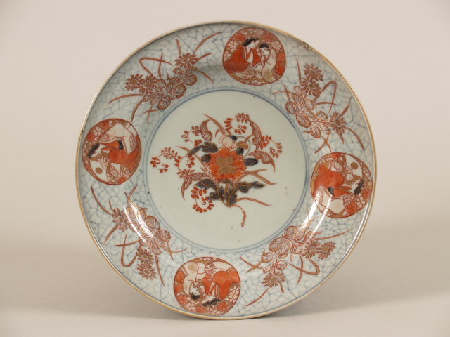 Bord in onderglazuur blauw en op het glazuur in rood, zwart en bruin. Op het plat een decor van een bos bloemen. De wand is op een gecraqueleerd achtergrond gedecoreerd met bloemranken afgewisseld door vier cirkels met twee verschillende voorstellingen; een vrouw en een man zittend en omgeven door bloemen en een voorstellingen van een zittende vrouw met een waaier. Vergulde rand. Op de achterzijde van de wand drie bloeiende takken en drie biezen. Op de onderkant een fuku-merk in cirkel. Imari-stijl (Nederlands)