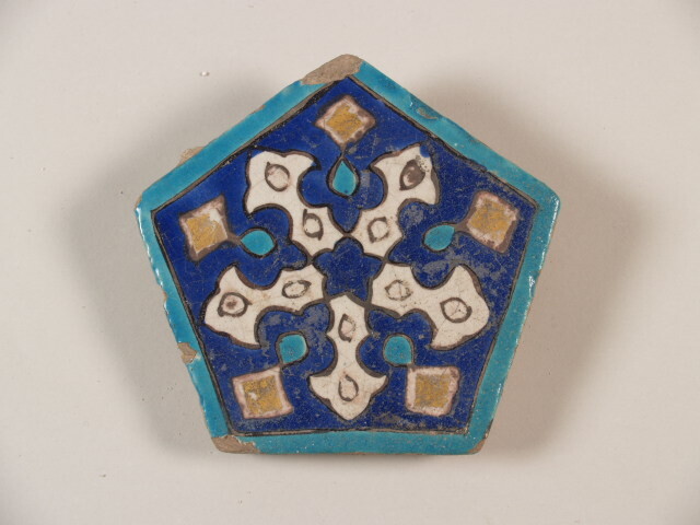 Tegel, vijfpuntig, met decor van geometrisch ornament met bladgoud (Nederlands)