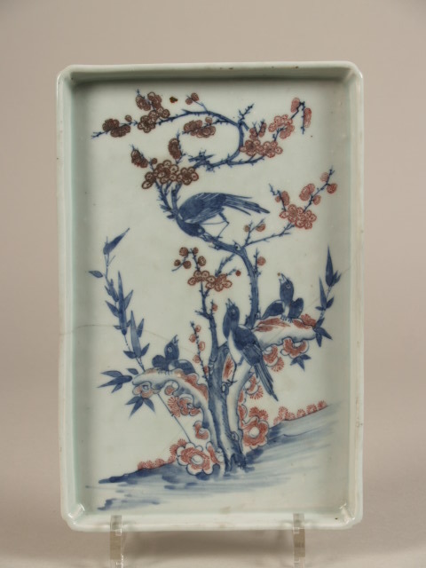 | Nederlands | Schaal, langwerpig, met decor van vogels en bloeiende takken in onderglazuur blauw en rood |