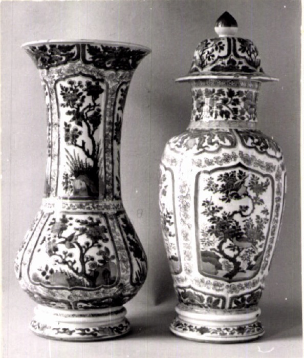 A, C, E: rechte bodem, glad geprofileerd spreidende voetring, gerekt eivormige wand, licht konkaaf staande rand. Deksel - korte recht verjongende sluitring, recht spreidende, accoladegewijs geschulpt afgesneden rand, ovaal verjongend gewelf, pijnappalvormige knop. B, D: rechte bodem, glad geprofileerd spreidende voetring, breed omgekeerd eivormige wand, hoge, hol spreidende hals. Materiaal - licht geel brandend porselein met licht grijs getint glzazuur. Onderkant voetring en sluitringpartij ongeglazuurd. Versiering - in kobaltblauw telkens vier, accoladegewijs afgesloten vakken met vogels op bloeiende heesters, daartussen bloemranken. (Nederlands)