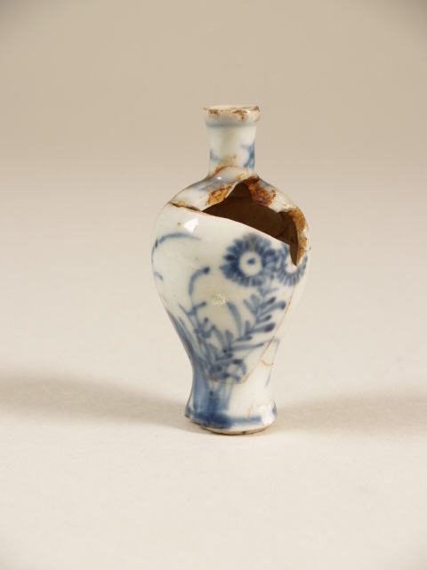 | Nederlands | Scherf van miniatuurvaas met decor van bloemen in onderglazuur blauw |