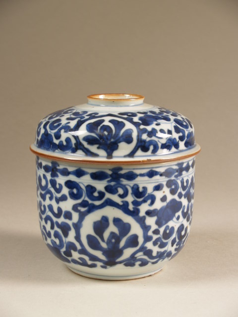 Pot met deksel en decor van medaillon met lotus omgeven door ranken (Nederlands)