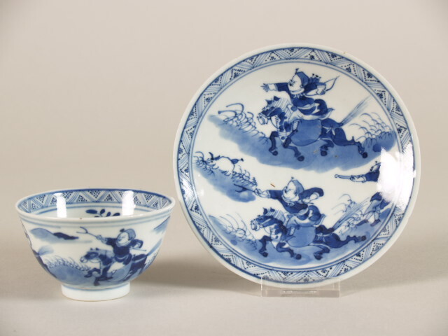 Konvekse bodem, afgerond v-vormeige (kop: rechte) voetring, s-vormig spreidende wand. Materiaal - zeer lichtgeel brandend porselein met blank glazuur. Onderkant voetring , niet nauwkeurig, afgerond en ongeglazuurd. Versiering - in kobaltblauw. Plat van de kop: een bloemtakje; dubbele bies; wand int.: vier bloemkakjes. Onder de lippen int. een band met zigzagarcering en gestippelde driehoekjes. Schotel int. en kop ext.: een landschap waarin drie mannen op een haas jagen, nl. een ruiter met pijl en boog, een andere ruiter met een gaffel en een voetganger met een buks. Op twee na heeft de voetganger op de koppen niet een buks maar een gaffel als tweede ruiter. Schotelwand ext.: drie bloemtakken. (Nederlands)