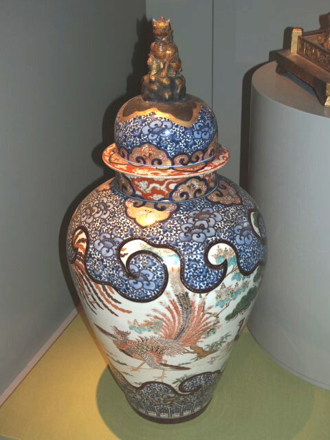 Konvekse bodem, trapezoïde, naar buiten verdikte voetring, eivormige wand, staande rand. Deksel - korte, verjongende sluitring, staande wand, overgaand in het konvekse gewelf. Bovenop een rotspartij met een zittende ch'ih-lin, niet van porselein? Materiaal - porselein met groengrijs getint glazuur. Onderkant voetring en sluitringpartij ongeglazuurd. Op de bodem twee proenspoortjes. De ch'íh-lin koud beschilderd. Versiering - in kobaltblauww en émaux rood, groen, aubergine, zwart en verguld. Om de voetring in blauw een zône met godrons en een uit- en omgestulpte rand met bloemen op rankenfond; op de schouder een brede, dergelijke rand.Het dekselgewelf is geheel gevuld met dit motief. Op de wand een landschap van dennebomen, prunus en ho-ho-vogels. Op schouder en op de rand, evenals op de dekselrand en -wand, resp. vier hangende en vier staande ju-i-koppen, om en omgeplattst met insecten en bloemen op goud; de rest van de rand en de rand van het deksel versierd met draken, uitgespaard en rood. Bovenop het deksel vier hangende punten, evenals de ch'ih-lin koud beschilderd in zwart en goud. (Nederlands)