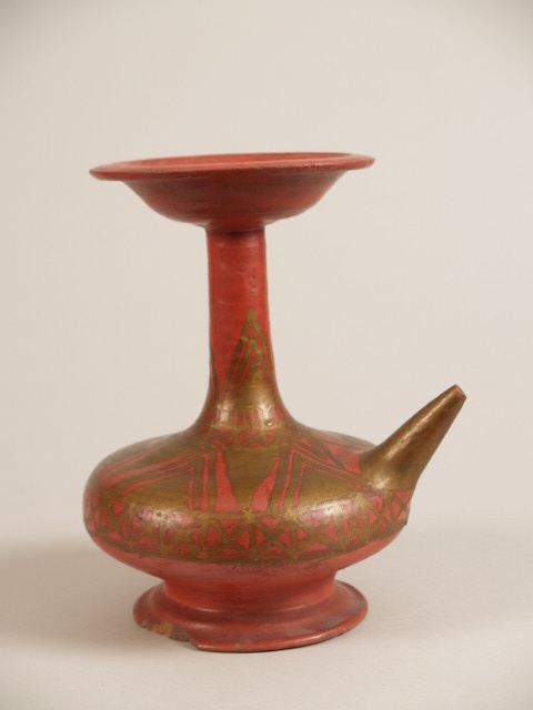 | Nederlands | Kendi van rood aardewerk met goudverf met bijbehorende trilboom van blik en hout met bloemen aan ijzeren draad |