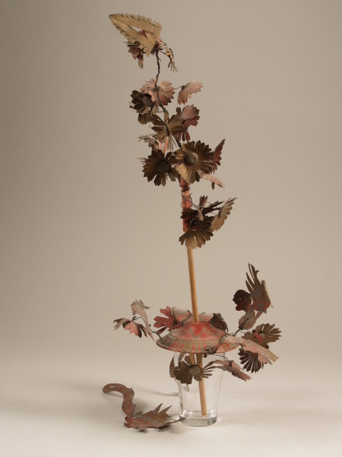 Kendi van rood aardewerk met goudverf met bijbehorende trilboom van blik en hout met bloemen aan ijzeren draad (Q24842)