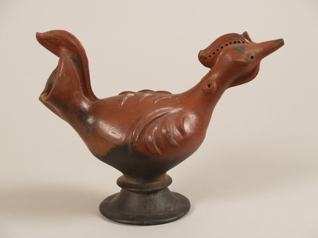 Kendi van rood aardewerk in vorm van haan (Nederlands)