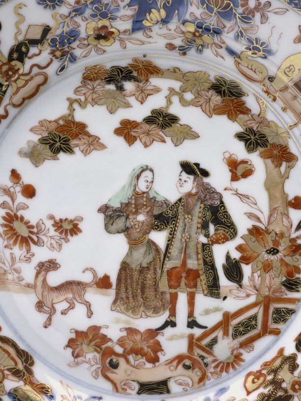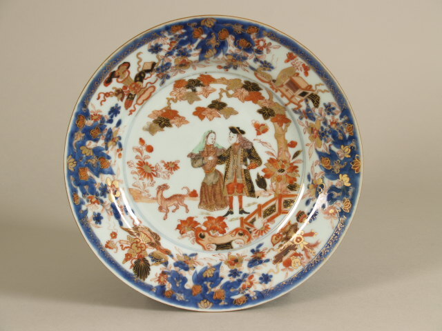 | Nederlands | Bord met decor van Europese dame en heer, symbolen en bloemen, imari |
